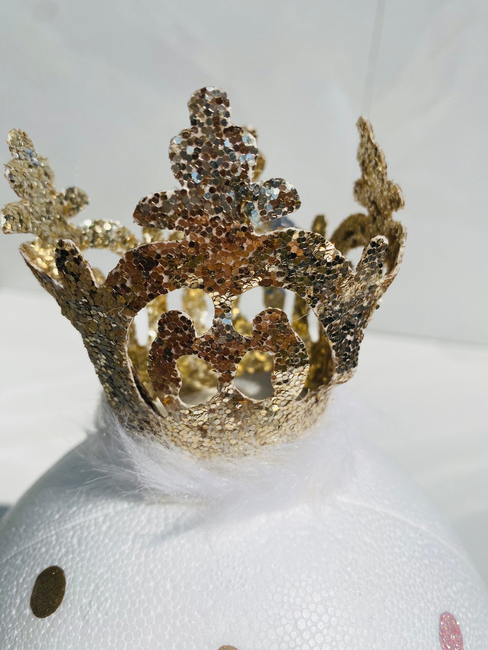 Das Luxus Ei ist mit Einhorn oder Krone mit Namen und bis zu 4 witern Wörtern und kleine glitzer Schleifen Kronen und Strass Steinen auf dem Ei verteielt